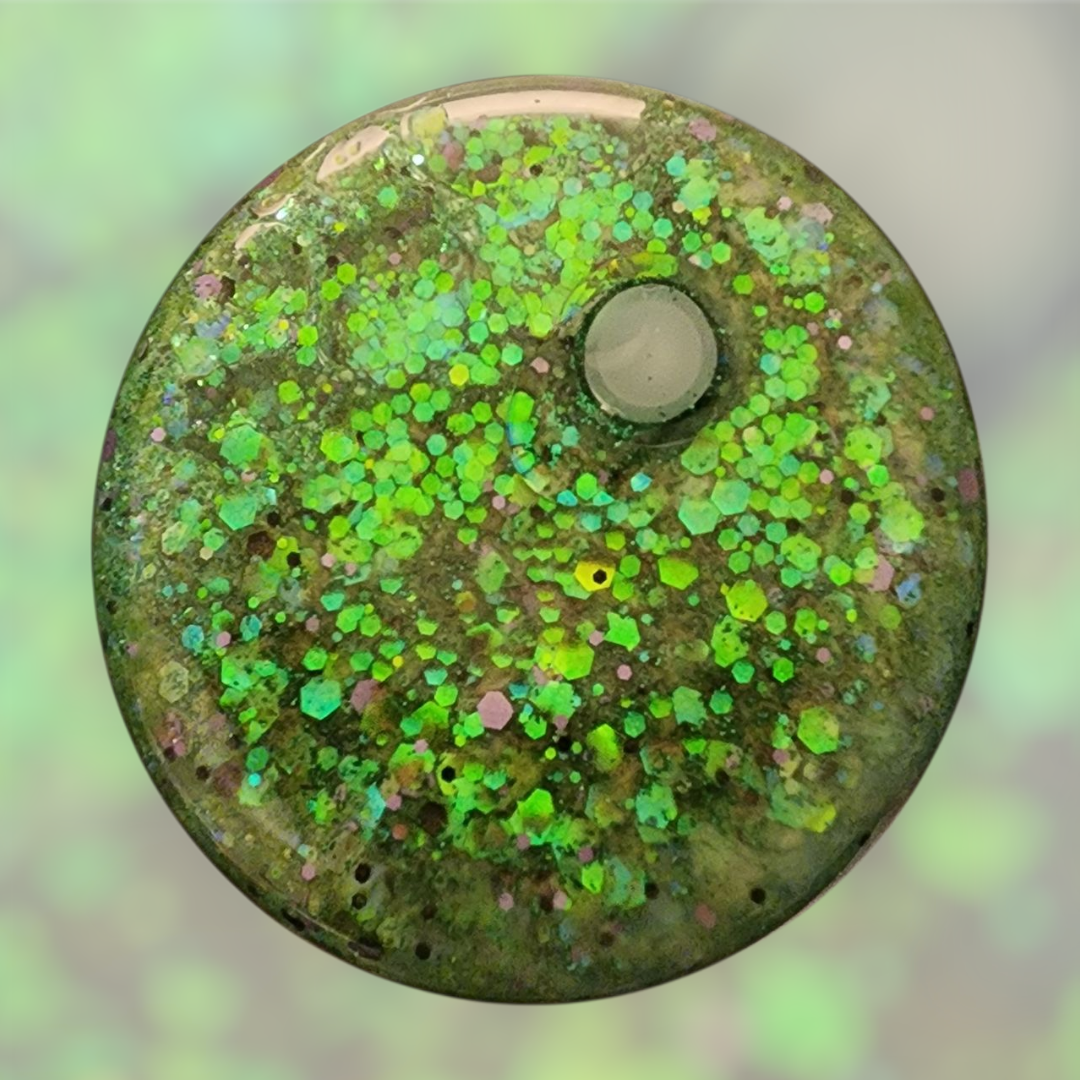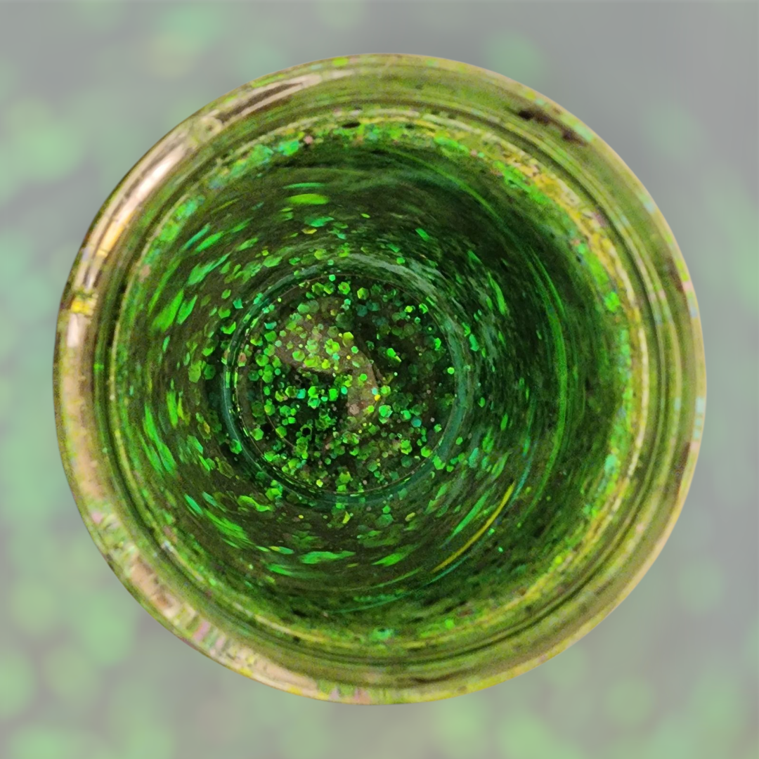 Hand-filled with slow-flow green holographic glitter and glycerin and distilled water